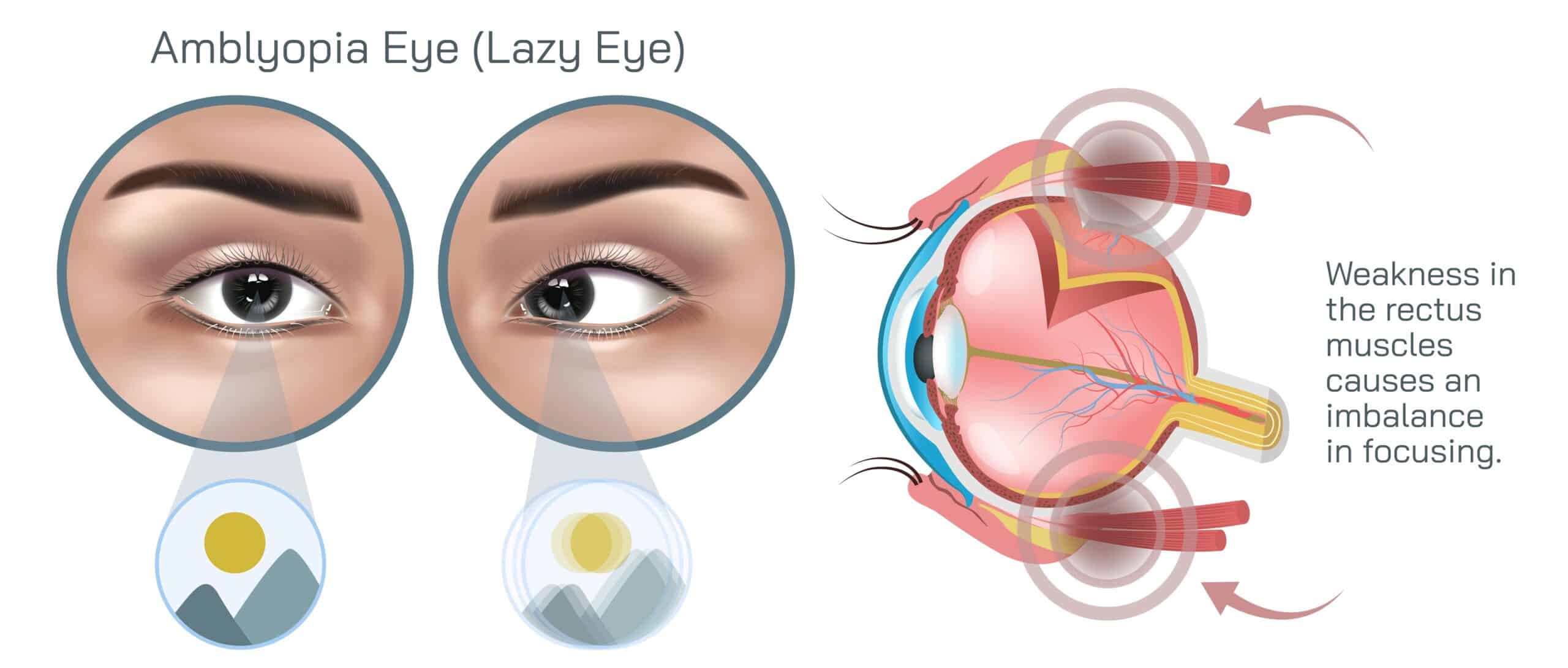 There are three possible causes of amblyopia: misalignment of the eyes, unequally focused or poorly focused eyes, or cloudiness of usually clear eye structures. When the eyes are misaligned (strabismus) the brain “ignores” the image in the eye that is not straight. If one or both eyes are poorly focused, a “blurred” image is sent to the brain from the affected eye, and poor vision results. Similarly, if there is a cloudiness in the eye, a poor image results and the “normal” pathways from the eye to the brain do not develop.